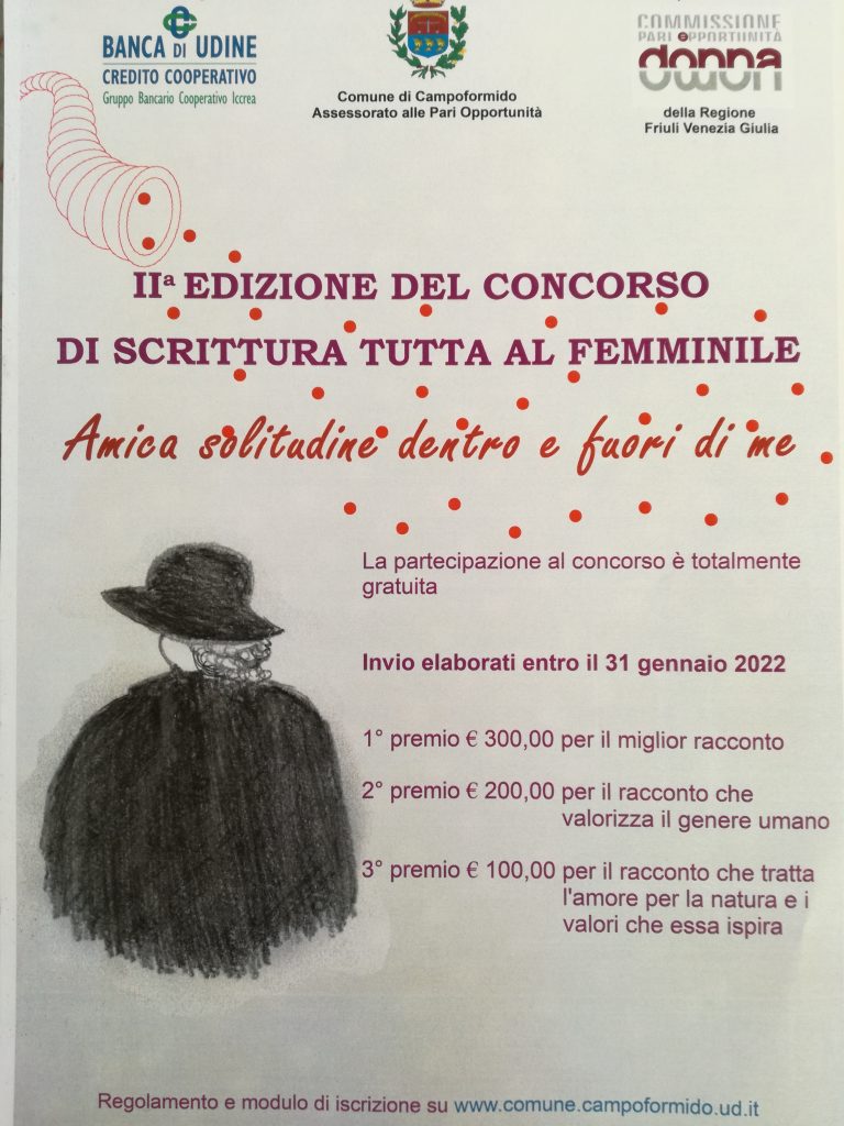 Quest'anno il tema del concorso è "Amica solitudine dentro e fuori di me". Tutte le donne maggiorenni di qualsiasi nazionalità e cultura che desiderano partecipare e condividere un loro scritto, possono inviare, via email al Comune di Campoformido ([email protected]), i propri elaborati fino al 31 gennaio 2022. Con il sostegno della Banca di Udine, sarà premiato il miglior racconto, colei che saprà valorizzare il genere umano e colei che racconterà l'amore per la natura e i valori che essa ispira.