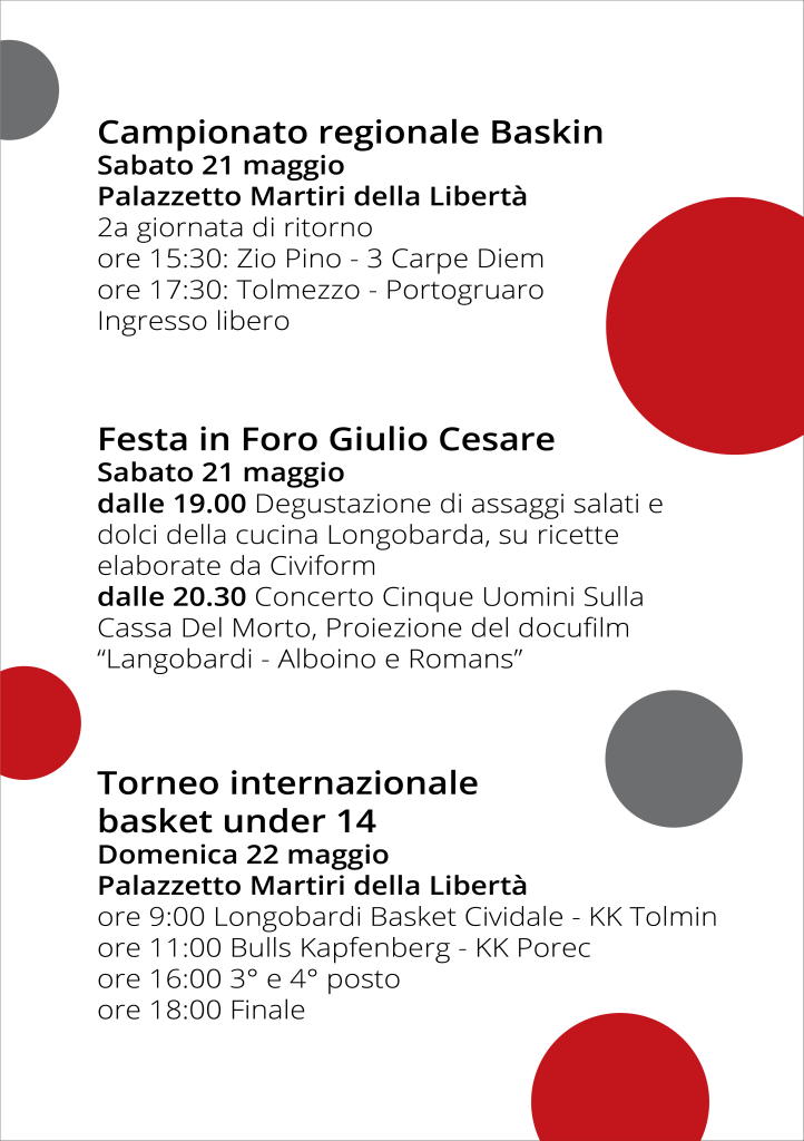 Nella sera di sabato 21 maggio si svolgerà, invece, la parte di carattere culturale e gastronomico in piazza Foro Giulio Cesare, dove, a partire dalle 19 verranno offerti, in numero limitato, degli assaggi salati e dolci di cucina longobarda su ricetta e preparazione di Civiform. La serata si concluderà nella stessa piazza con un concerto pubblico dei Cinque Uomini sulla Casa del Morto e con la proiezione del docufilm “Langobardi - Alboino e Romans”.