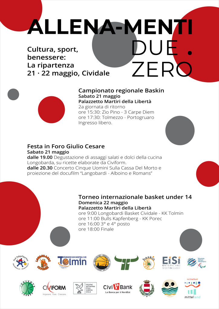 Nato dal bando regionale “Cultura, sport: la ripartenza”, nel weekend del 21 e 22 maggio sbarca a Cividale del Friuli il progetto Allena-Menti 2.0 organizzato da Tarcento Basket in collaborazione con il Comune di Cividale ed altre realtà.