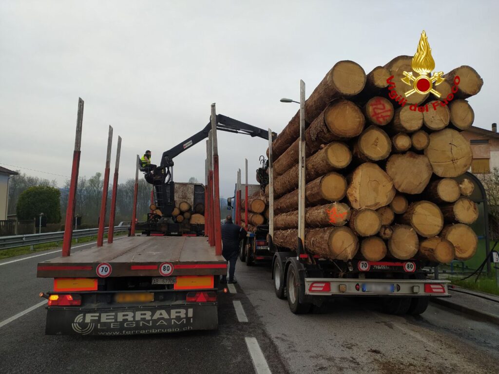 Il carico di tronchi in attesa di lavorazione, è stato successivamente spostato su un altro automezzo fatto arrivare sul posto.