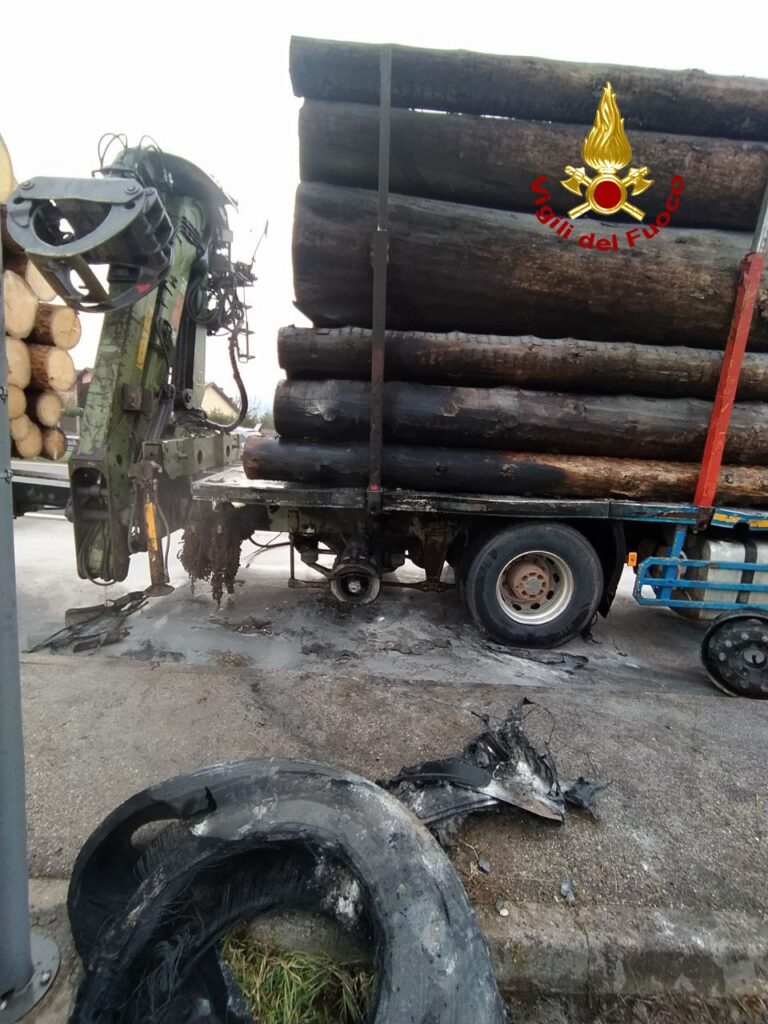 I pompieri arrivati dalla sede centrale con un’autopompa e un’autobotte hanno spento il principio d’incendio che ha riguardato uno pneumatico, evitando il coinvolgimento dell’intero carico di legname.