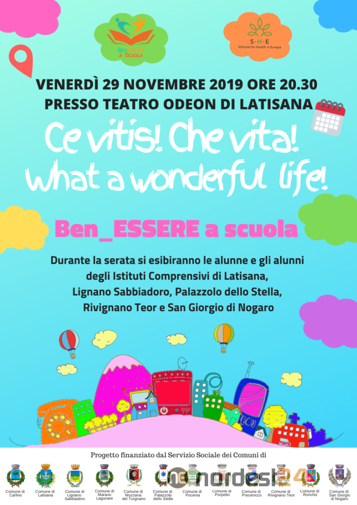 LATISANA – Gli alunni degli Istituti comprensivi di Latisana, Lignano Sabbiadoro, Palazzolo dello Stella, Rivignano Teor e San Giorgio di Nogaro saranno i protagonisti di “Ce vitis! Che vita! What a wonderful life!”, la speciale serata prevista al Teatro Odeon di Latisana venerdì 29 novembre alle 20.30 per raccontare il primo anno di vita del progetto “Ben_ESSERE a scuola”.