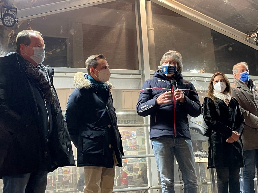 Bini, dopo avere acceso simbolicamente il grande albero di Natale issato in piazza Fontana e il Villaggio natalizio allestito tra la Fontana e la Terrazza Mare, nel visitare le attrazioni predisposte, ha inaugurato anche la pista di pattinaggio su ghiaccio, in piazzale San Giovanni Bosco, il grande Presepe di sabbia e ha infine visitato la casetta di Promoturismo, che consentirà di promuovere le principali attrattive del Friuli Venezia Giulia.