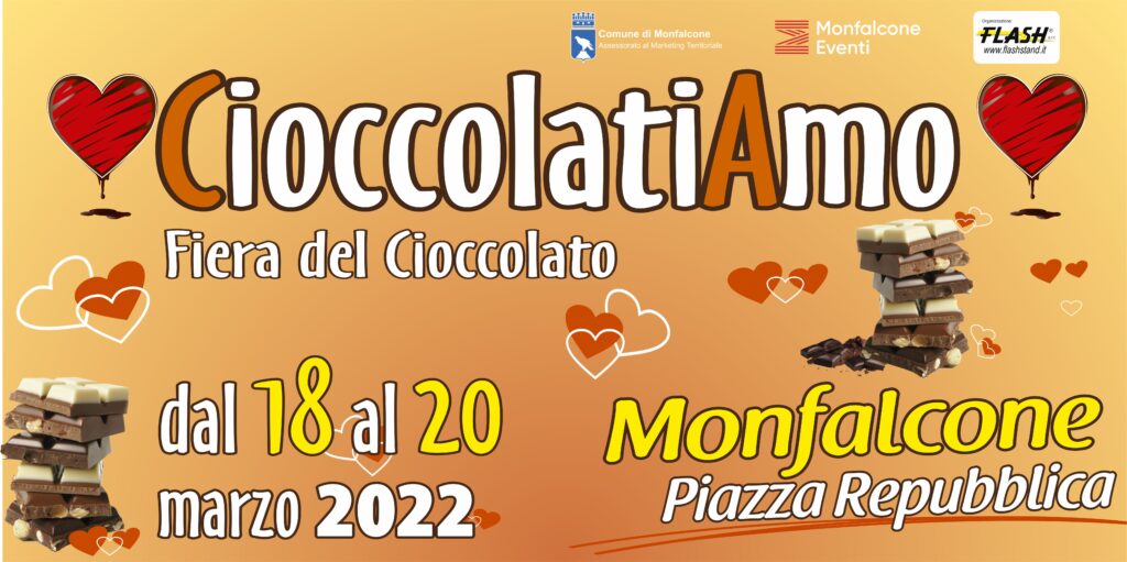 Dal 18 al 20 marzo 2022 dalle 9 alle 22 ritorna a Monfalcone, nella centralissima piazza della Repubblica, “Monfalcone in Cioccolato - CioccolatiAmo”, la grande Festa del Cioccolato Artigianale dedicata a grandi e piccini. L'attesissima rassegna annuale a ingresso libero dedicata al “Cibo degli dei” avrà per protagonista assoluto il cioccolato con tanti assaggi e moltissime novità. Per tre giorni ci saranno golosità e tanto cioccolato per tutti, Artisti in vetrina con i Maestri cioccolatieri di Perugia e, a grande richiesta, dopo il successo della prima presenza a Monfalcone, la prima Fabbrica Culturale del Cioccolato Itinerante in Europa, a disposizione per visite guidate gratuite delle scuole di Monfalcone e zone limitrofe. Tra gli appuntamenti proposti, anche il Laboratorio per bambini. In collaborazione con l’Artigiano Perugino è previsto inoltre un ricchissimo calendario di appuntamenti golosi che mescoleranno cultura, sapori e divertimento e di incontri con i Maestri cioccolatieri. Strutture confortevoli ospiteranno i selezionatissimi espositori provenienti da tutta Italia.