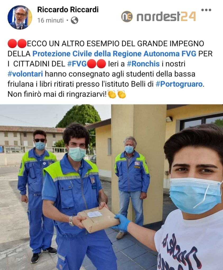 Di seguito le foto di Giuseppe Di Leo con i volontari della protezione civile durante la consegna, inoltre il post facebook fatto dal vicepresidente della regione Friuli Venezia Giulia: Riccardo Riccardi, che ha voluto dare rilievo all'attività svolta a favore degli studenti della bassa friulana.