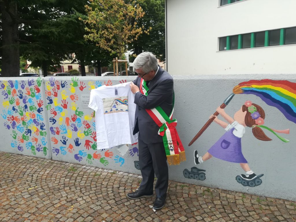 Alla fine dell’incontro i genitori hanno regalato al Sindaco una maglietta con la riproduzione di uno dei due murales raffigurante una bambina che cammina colorando il mondo e calpestando dei piccoli carri armati.