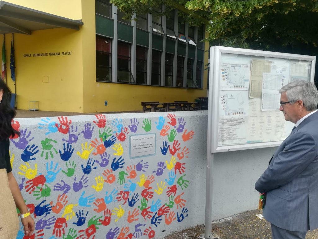 UDINE. Questa mattina il Sindaco Pietro Fontanini e l’Assessore all’istruzione Elisabetta Marioni hanno partecipato alla presentazione dei murales eseguiti dagli alunni delle scuole primarie Giovanni Pascoli e di Toppo Wassermann sul muretto del giardino dell’istituto che li ospita.