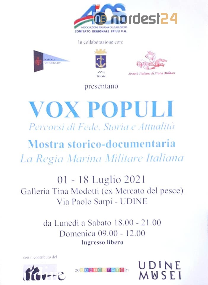 Giovedì 1° luglio si è inaugurata alla Galleria “Tina Modotti” di Udine la prima edizione della Rassegna VOX POPULI - Percorsi di Fede, Storia e Attualità, organizzata dal Comitato regionale Fvg dell’AICS (Associazione Italiana Cultura Sport), con il sostegno del Comune di Udine e il coinvolgimento diretto di diverse associazioni socio-culturali del territorio.