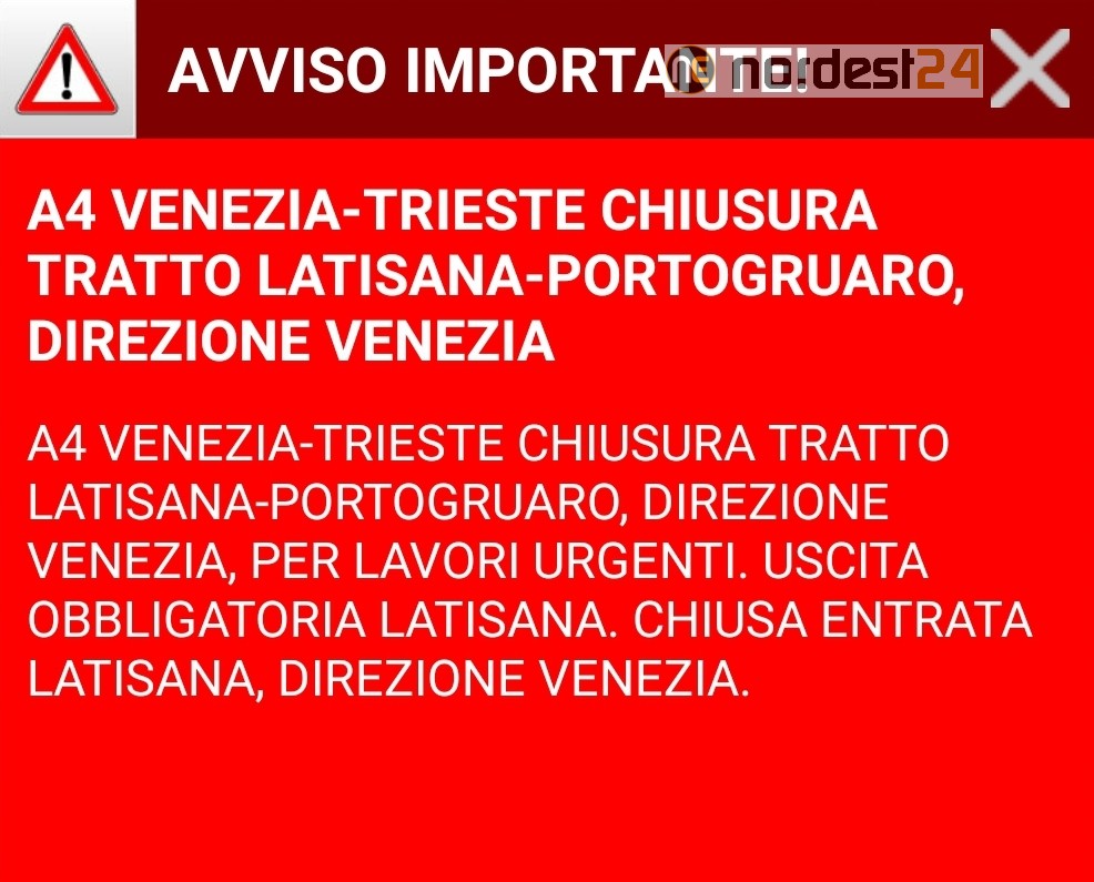 A4 Venezia-Trieste, si segnala la chiusura del tratto Latisana - Portogruaro, direzione Venezia, per lavori urgenti.