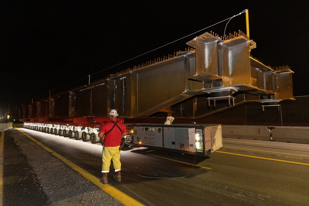 Complessivamente, l’impalcato del ponte varato nella notte pesa circa 280 tonnellate ed è formato da 5 travi della lunghezza di 48 metri l’una e del peso di 50 tonnellate ciascuna.