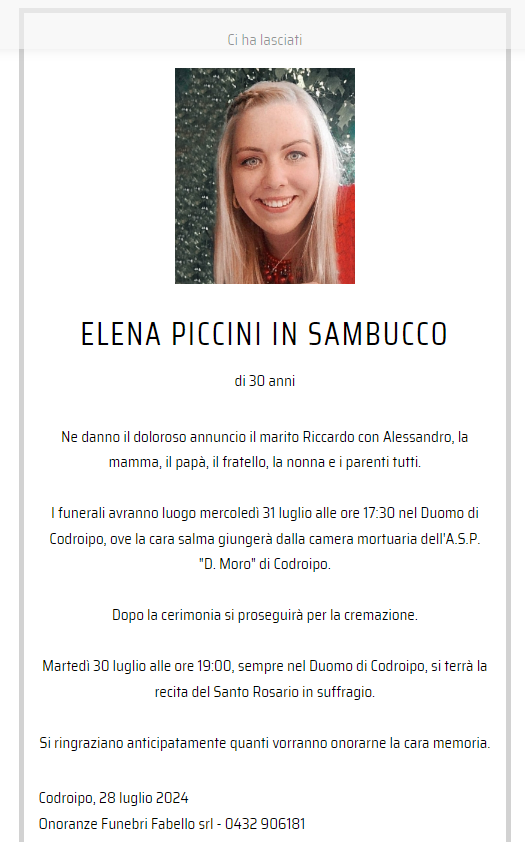 I funerali di Elena si svolgeranno mercoledì 31 luglio alle 17.30, presso il duomo di Codroipo. In serata, alle 19, si terrà un rosario in sua memoria. Questo evento rappresenta l’occasione per amici e familiari di onorare la sua memoria e di accompagnarla nell’ultimo viaggio, ricordando il suo sorriso e la sua forza.