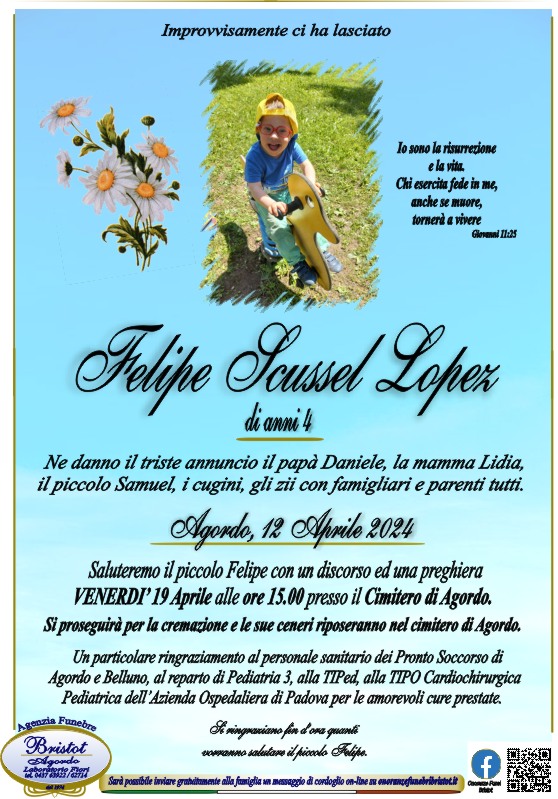 AGORDO (BELLUNO). Agordo è stata improvvisamente sconvolta dalla triste notizia della scomparsa di Felipe Scussel Lopez, morto all'età di soli quattro anni a causa di un arresto cardiaco.