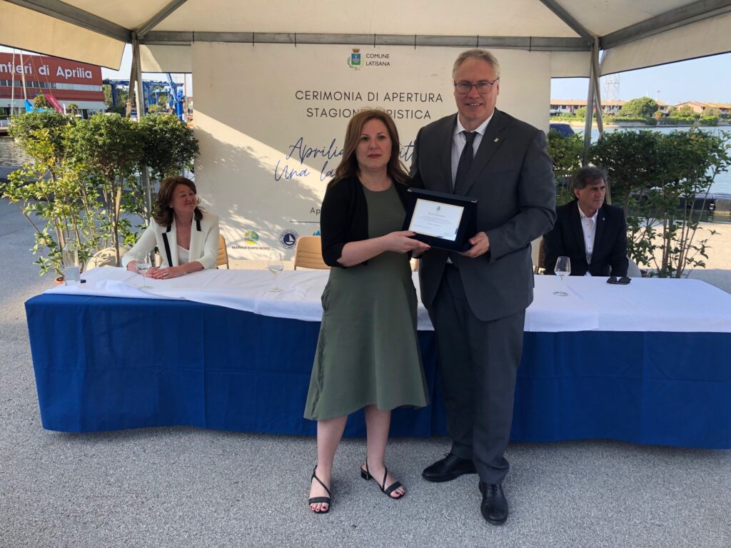 Al termine della cerimonia il sindaco Lanfranco Sette ha consegnato una serie di riconoscimenti a personalità del territorio che si sono impegnate nella crescita della località: Lucia Meneghin, per aver gestito e incrementato professionalmente i rapporti coni partner europei sviluppando la collaborazione con le maestranze di Aprilia Marittima; Erica Romanin, per la professionalità e la caparbietà che l'hanno accompagnato nel percorso lavorativo nella Società Aprilia Marittima 2000; Gianna Pilosio, dipendente del Condominio Darsena, per aver svolto per 25 anni il proprio lavoro con cura e dedizione e Paola Neri per l'attento servizio che ogni giorno regala agli ospiti del Marina Punta Gabbiani.