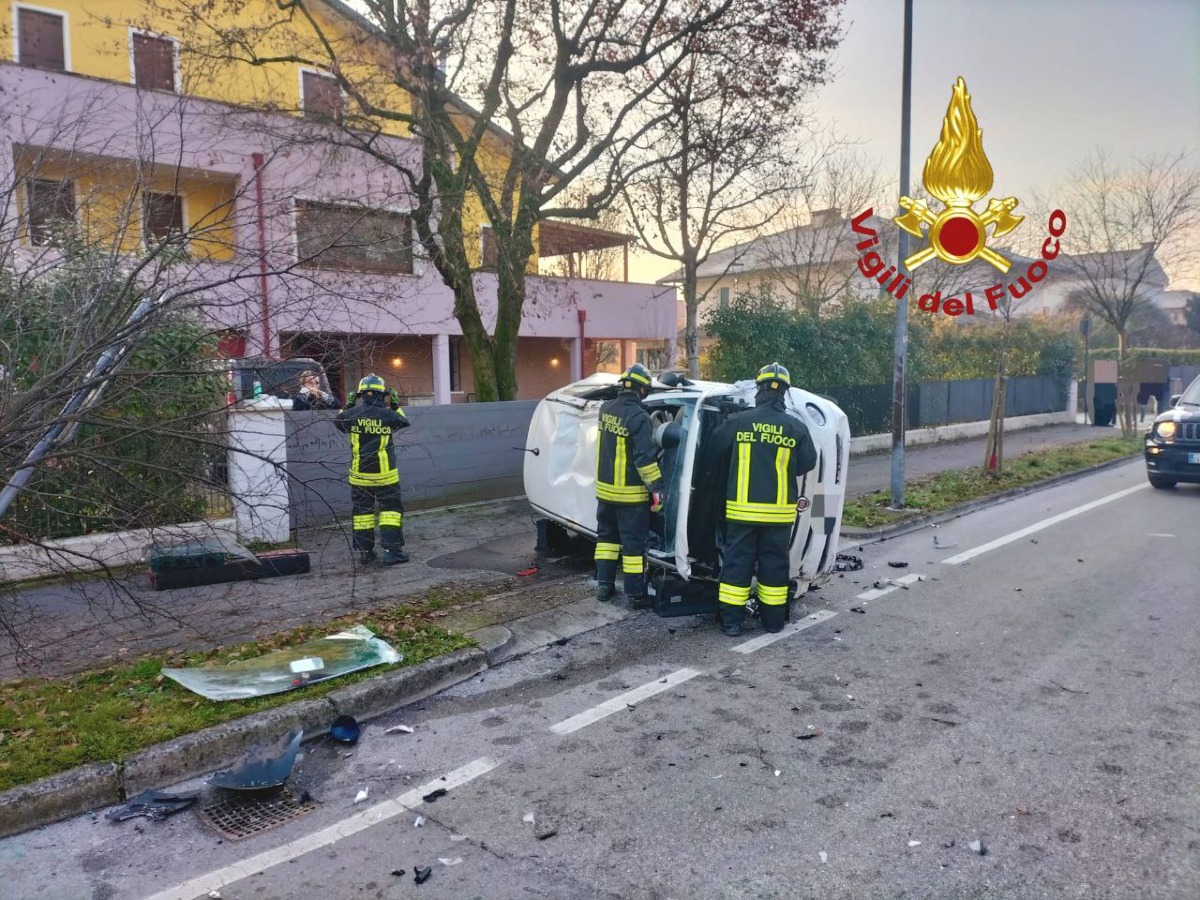 Auto finisce sul fianco dopo un incidente in via Don Milani ad Albignasego: una persona estratta e affidata al 118.