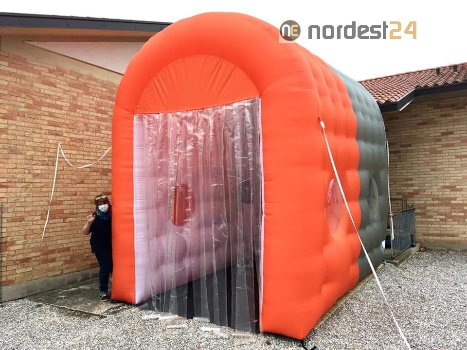 La stanza è posizionata a ridosso di una delle uscite della nostra casa di riposo. Si tratta di una struttura gonfiabile divisa al centro da una parete in plastica trasparente.