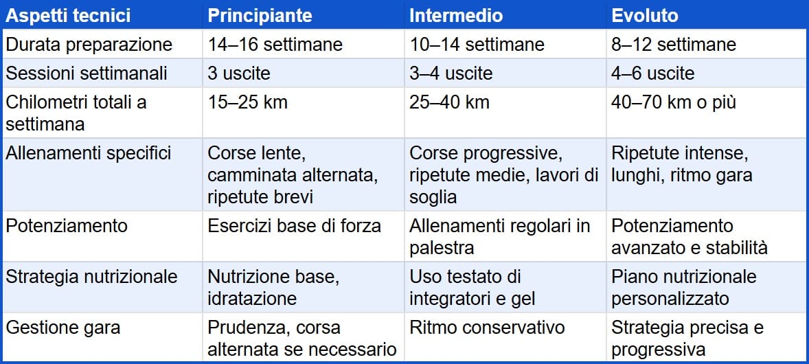 - Allenamenti: Corse progressive, ripetute medie, lavori di soglia
