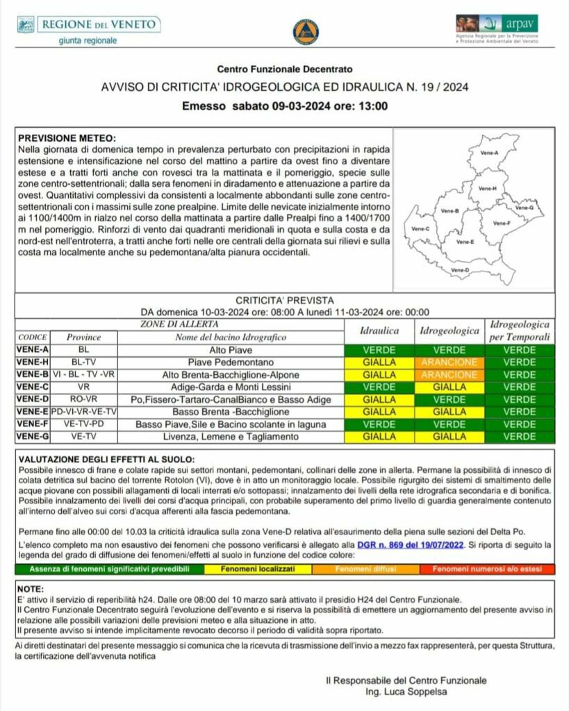 Le avverse condizioni meteorologiche aumentano significativamente il rischio di valanghe in quota, oltre a rendere possibile l'innesco di frane e smottamenti nelle zone montane, pedemontane e collinari. Particolare attenzione viene rivolta anche agli innalzamenti dei livelli dei fiumi principali. A Vicenza, già messa a dura prova nei giorni scorsi, è prevista una nuova riunione del Centro Operativo Comunale (Coc) per valutare le misure da adottare.
