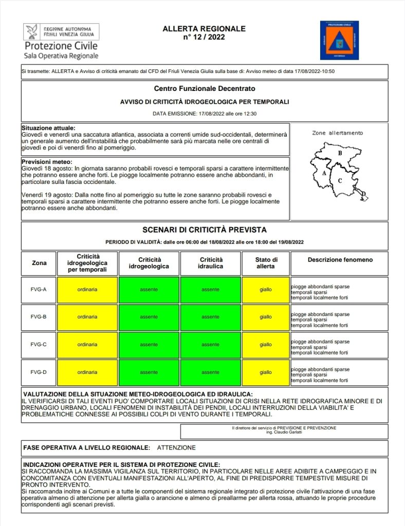 Allerta meteo in Friuli Venezia Giulia dalle ore 06:00 del 18/08/2022 alle ore 18:00 del 19/08/2022.