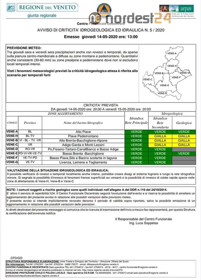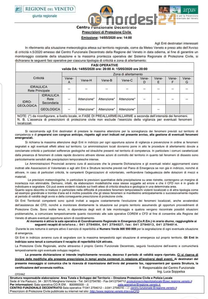 Visti i fenomeni meteorologici previsti il Centro funzionale decentrato della Protezione Civile del Veneto ha dichiarato lo stato di attenzione (allerta gialla) per possibili criticità idrogeologiche nella rete idraulica dei bacini del Piave Pedemontano, Alto Brenta, Bacchiglione, Alpone, Alto Garda e Monti Lessini