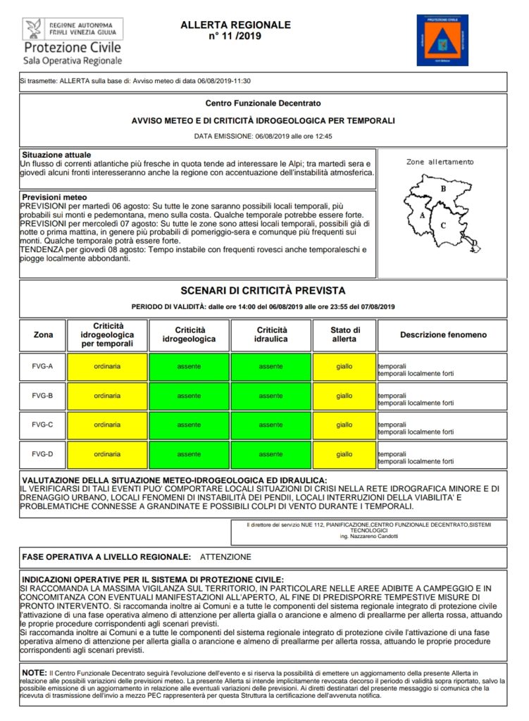 L'allerta gialla ha inizio oggi 6 agosto 2019 alle ore 14 e terminerà domani mercoledì 7 agosto 2019 alle 23.
