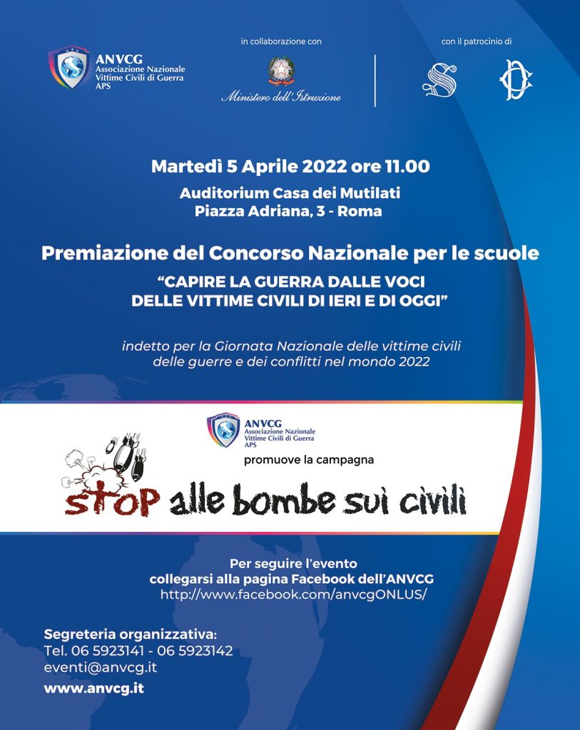 Martedì 5 aprile 2022 alle ore 11:00, all’Auditorium della Casa Madre dei Mutilati a Roma (Piazza Adriana, 3), l’Associazione Nazionale Vittime Civili di Guerra ha organizzato – in collaborazione con il Ministero dell’Istruzione e con il patrocinio del Senato e della Camera dei Deputati – la premiazione della 5ª edizione del concorso nazionale per le scuole per la Giornata Nazionale delle vittime civili delle guerre e dei conflitti nel mondo, dal titolo “Capire la guerra dalle voci delle vittime civili di ieri e di oggi”.