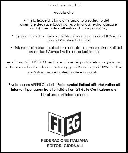I rappresentanti della Fieg, attraverso un appello al Parlamento pubblicato su tutte le testate giornalistiche, evidenziano che nella legge di Bilancio sono previsti finanziamenti per il cinema e gli spettacoli dal vivo, nonché oneri per il Superbonus 110%. Esprimono preoccupazione per l'esclusione del settore dell'informazione professionale e di qualità dalla Legge di Bilancio 2025. Rivolgono un appello a tutti i parlamentari affinché supportino il pluralismo dell'informazione e l'effettività dell'articolo 21 della Costituzione.