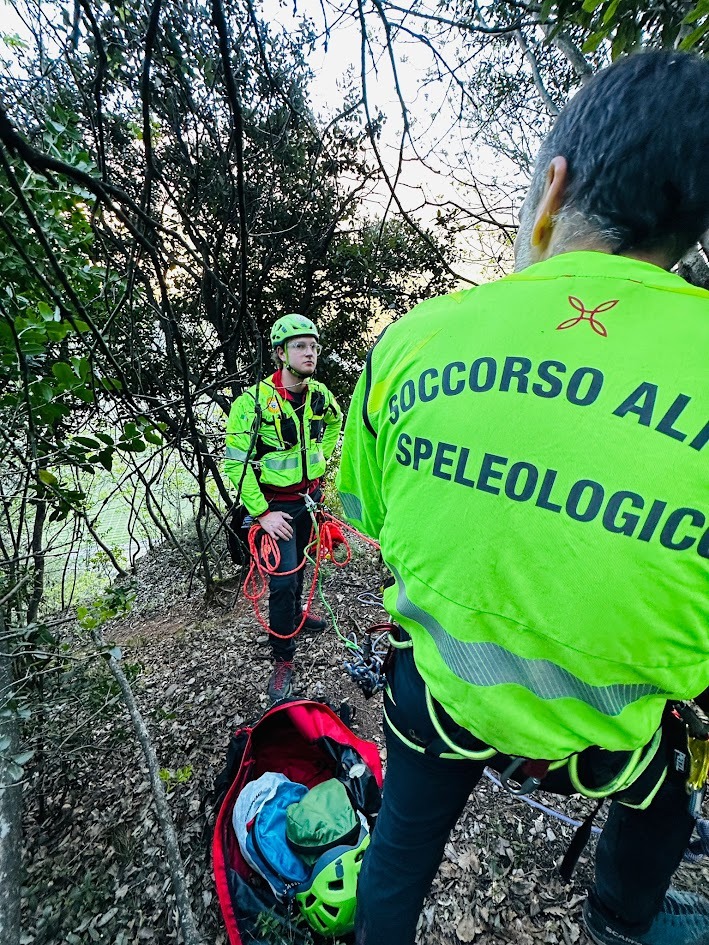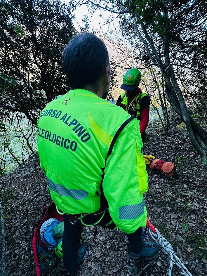 L’intervento ha richiesto una discesa di circa 200 metri, necessaria per riportare entrambi a valle. Dei sei operatori del Soccorso Alpino impegnati nelle manovre, due sono scesi direttamente, tre si sono posizionati in sosta per gestire i passaggi tecnici e garantire il corretto assetto della calata, mentre uno è rimasto a terra con il binocolo per seguire dall’esterno tutte le fasi dell’operazione e guidare i movimenti in verticale.