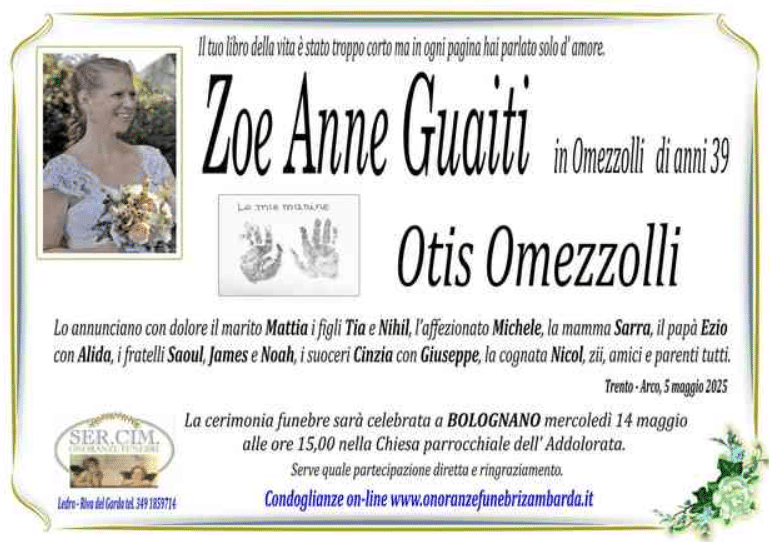 ARCO (TRENTO) – Una cerimonia toccante ha accompagnato l’addio a Zoe Anne Guaiti, 39 anni, e al piccolo Otis, il bimbo che portava in grembo, entrambi scomparsi tragicamente il 5 maggio. Nella chiesa dell'Addolorata di Bolognano, parenti, amici e cittadini si sono stretti in un silenzioso abbraccio di dolore.