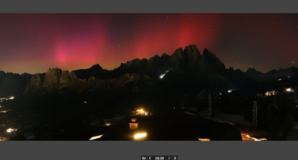 Dalle webcam di Cortina sono giunte immagini straordinarie, con la pale di neve che riflettevano la luce delle aurore, creando un contrasto affascinante con il cielo notturno. L'intensità del fenomeno è aumentata man mano che il buio calava, regalando un vero e proprio spettacolo di luci.
