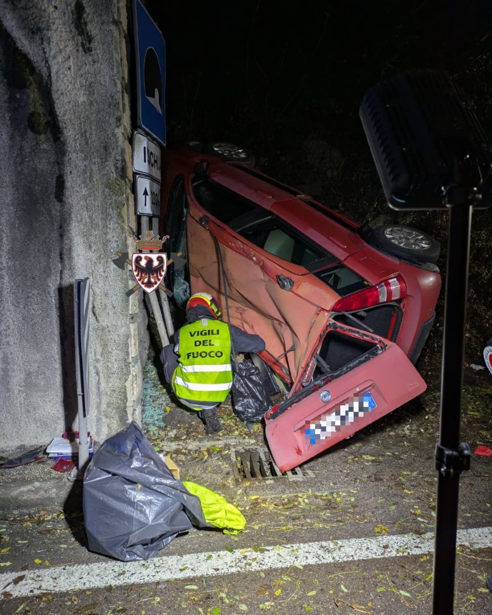 Pergine Valsugana, auto si ribalta e finisce contro il muro della galleria Ischia: conducente illeso, intervento dei Vigili del Fuoco e Trentino Emergenza.