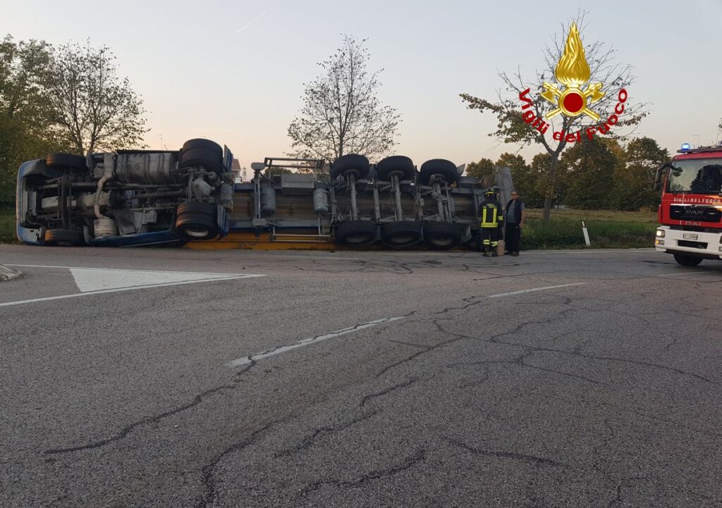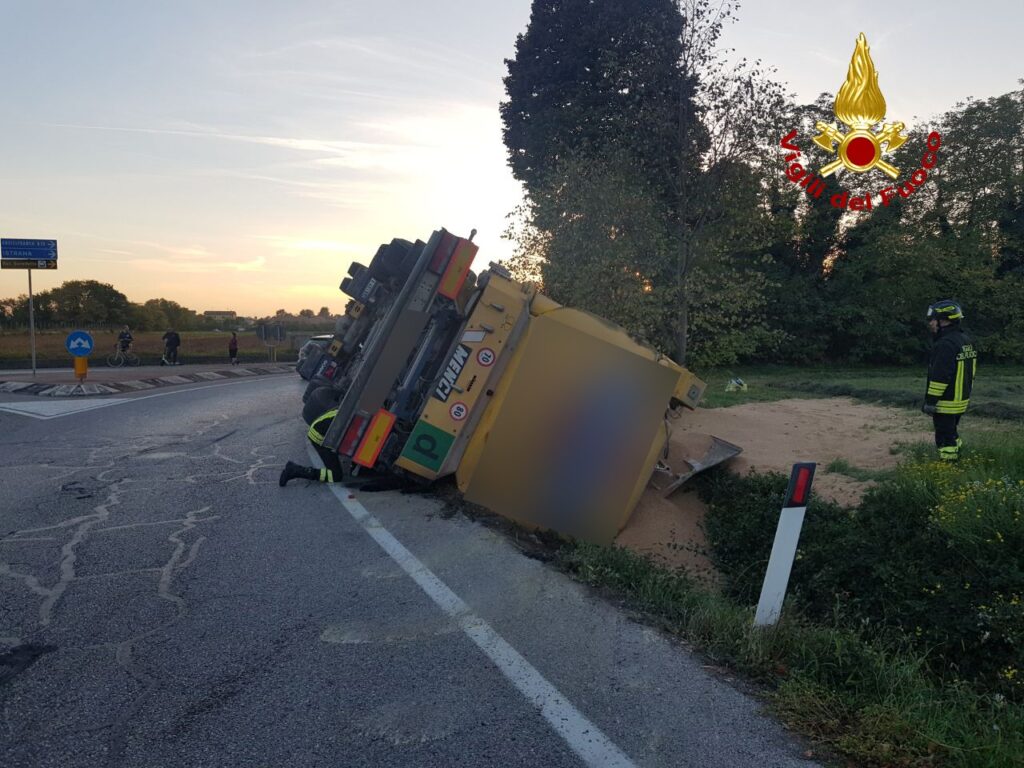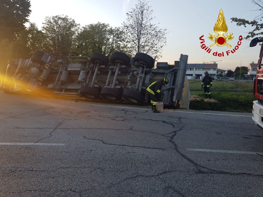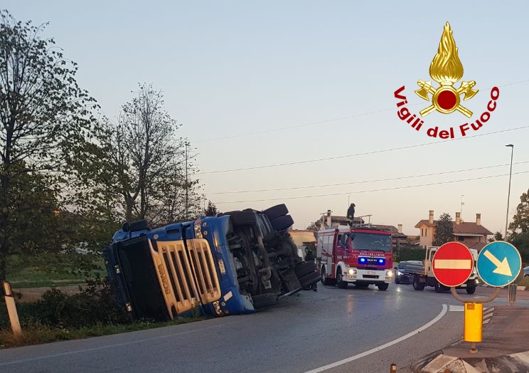 Alle 17:40, i vigili del fuoco sono intervenuti in Via Castellana a Padernello, frazione del comune di Paese in provincia di Treviso, per un autoarticolato carico di mangimi finito rovesciato a bordo strada: illeso l’autista.