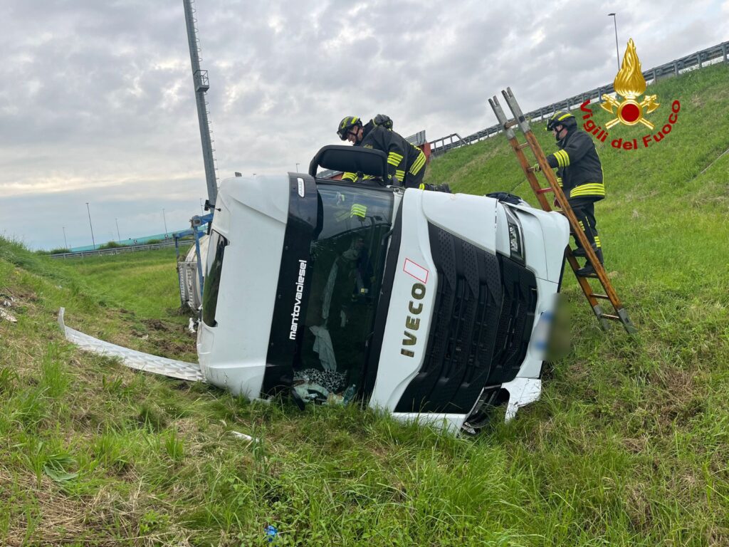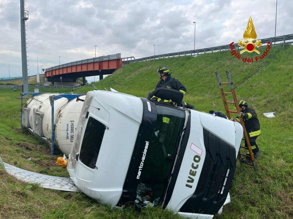 MIRA ORIAGO (VENEZIA). Alle 19:00, di oggi giovedì 30 maggio, i vigili del fuoco sono intervenuti sullo svincolo autostradale dell’A 57 di Mira Oriago per un’autocisterna alimentare finita fuori strada sotto il piano stradale: ferito l’autista.