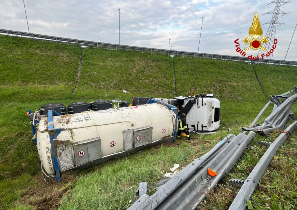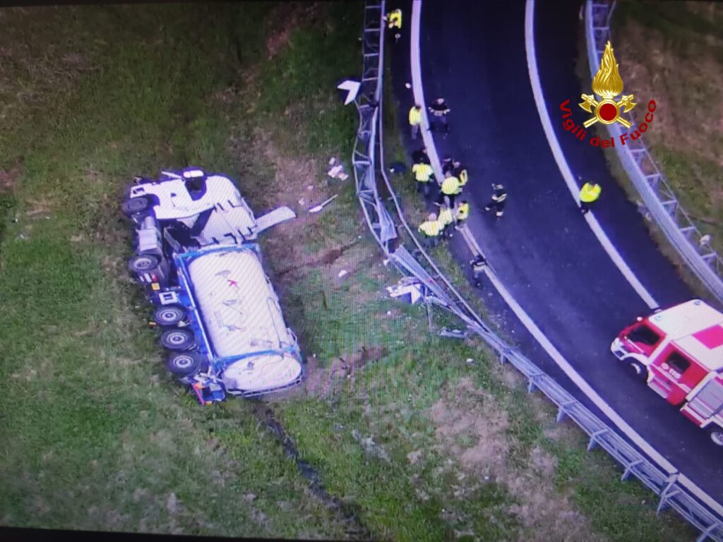 Autocisterna del latte vola fuori strada allo svincolo: ferito l'autista