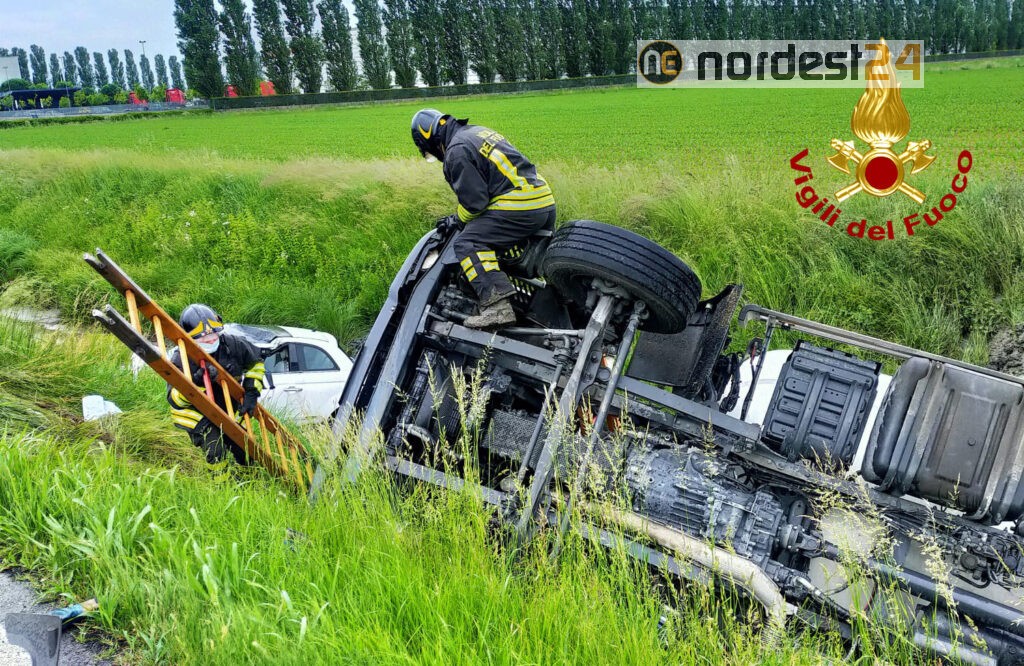 I pompieri arrivati da San Donà, Motta di Livenza, Mestre e Treviso con l’autogrù, hanno messo in sicurezza i mezzi ed estratto dalla cabina del camion rovesciato l’autista rimasto incastrato.