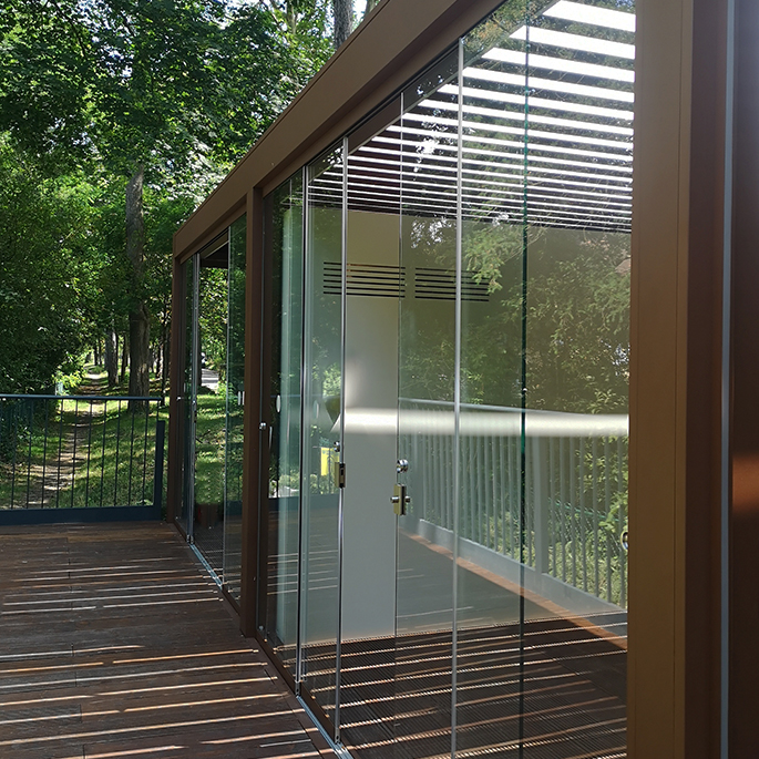 La pergola specchiata di Pratic utilizza le vetrate Fix Glass e Slide Glass 60, che impiegano la tecnologia Spy Glass. Questa innovativa soluzione riflette il paesaggio circostante, garantendo la massima privacy per chi si trova all'esterno, mentre l'interno offre una vista panoramica mozzafiato. Connect consente una connessione unica con la natura, mantenendo al contempo la riservatezza necessaria.