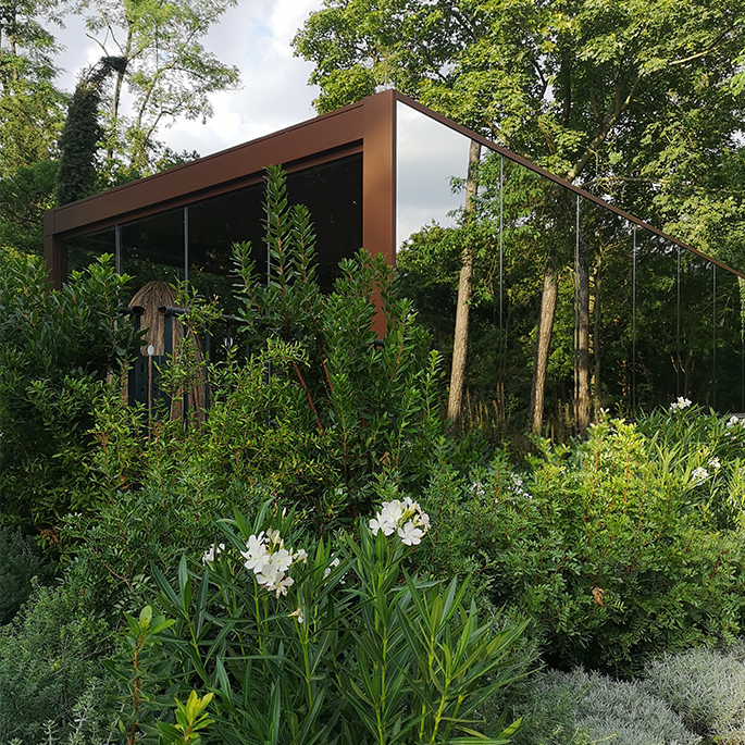 Il design della pergola si distingue per le linee essenziali e il colore Corten dell’alluminio, che riduce l'impatto ambientale. Questo elemento di design si integra armoniosamente con lo stile Napoleone III del palazzo e valorizza il giardino circostante. L'uso della pedana modulare Set permette di installare la pergola su terreni irregolari, rendendola reversibile e senza necessità di pavimentazioni permanenti.