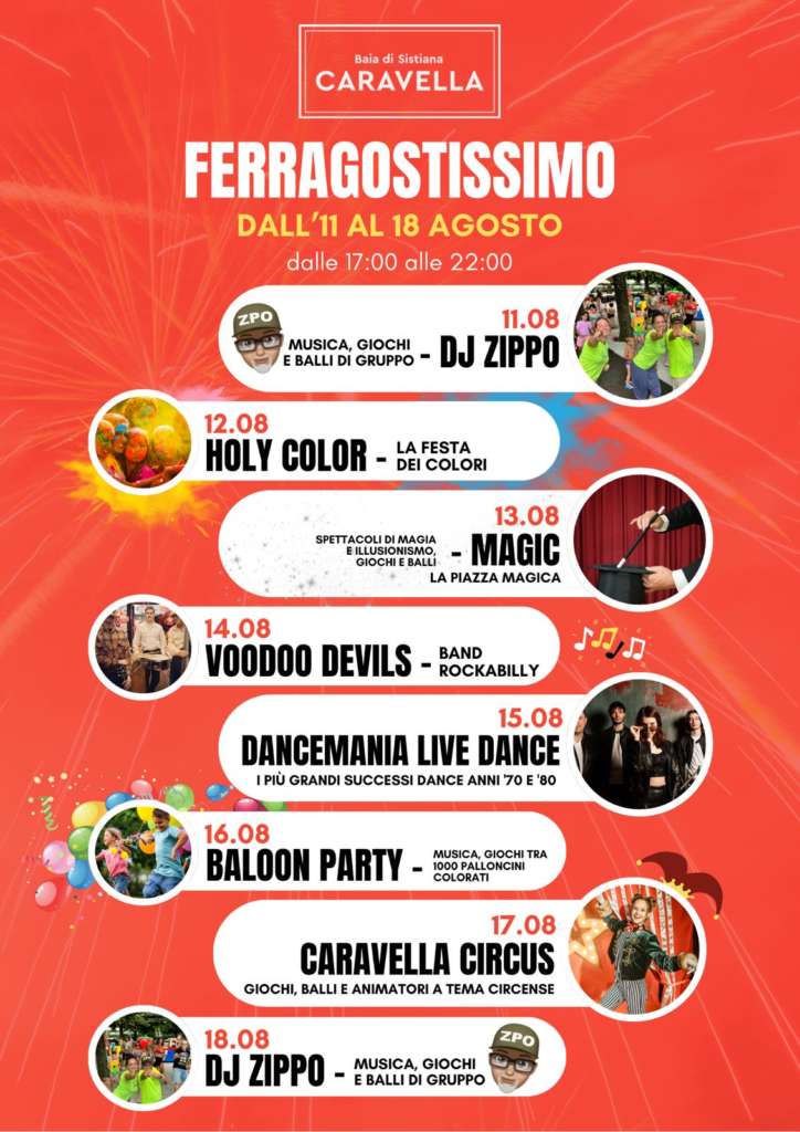 Il programma continuerà con una serie di eventi dedicati ai bambini, come la festa dei colori il 12 agosto, spettacoli di magia e illusionismo il 13 agosto, e un baloon party per giocare e ballare tra i palloncini il 16 agosto. Il caravella circus, previsto per il 17 agosto, vedrà i partecipanti in abiti a tema, mentre la settimana si concluderà il 18 agosto con una nuova esibizione di DJ Zippo.