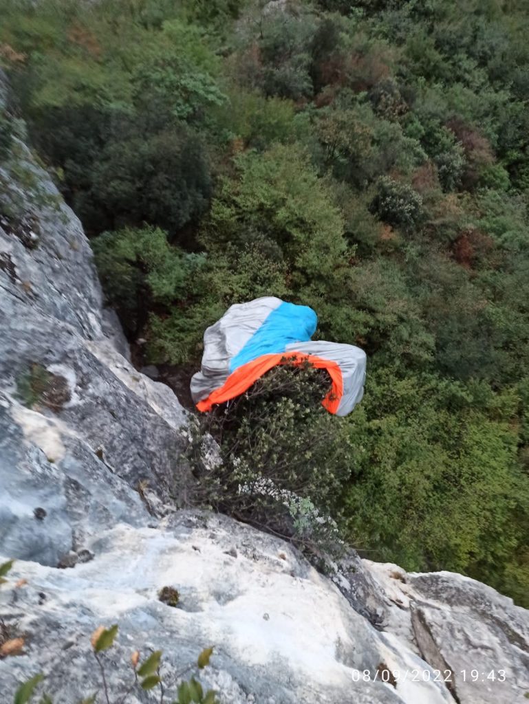 L'elicottero, proveniente da un altro intervento, si è subito recato sul target, la cui vela aperta era rimasta accidentalmente incastrata ai rami di un albero, ad una quindicina di metri dal suolo e ad un paio di metri circa dalla roccia. I soccorritori hanno dunque deciso di procedere con un intervento da terra: quattro uomini sono stati elitrasportati in vetta, insieme al medico, in modo da potersi calare per un centinaio di metri fino all'uomo e calarlo a loro volta a terra.