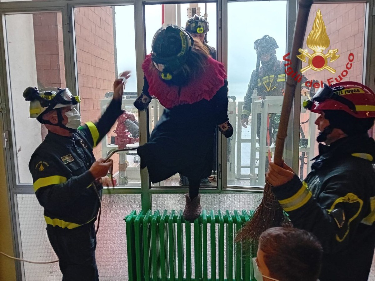 La simpatica figura tradizionale è apparsa improvvisamente sulla sommità dell’edificio e, tra lo stupore generale, è stata messa in salvo con una discesa controllata dal quinto piano, utilizzando le attrezzature operative.