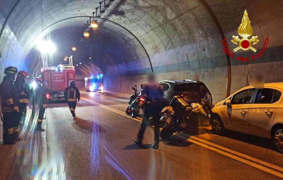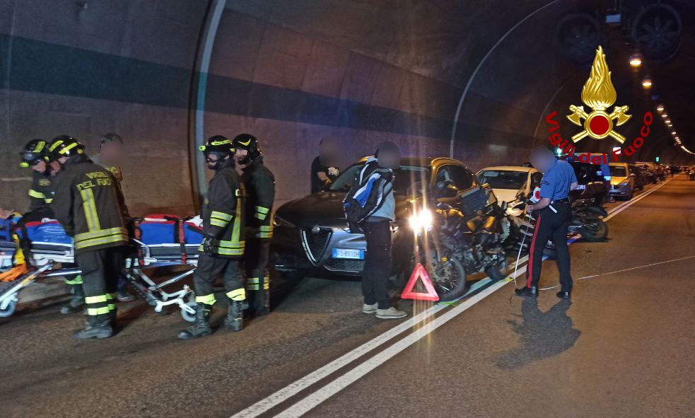 Terribile scontro in galleria fra tre moto e tre auto: feriti due centauri