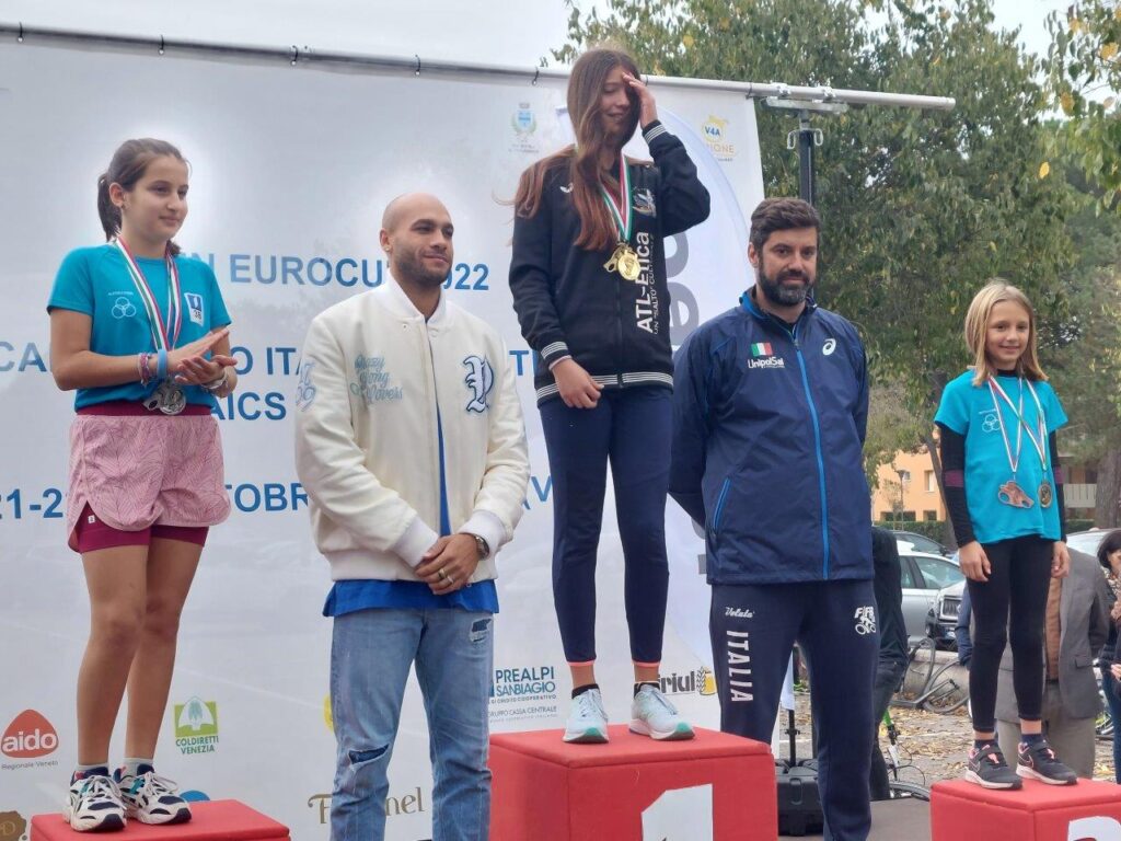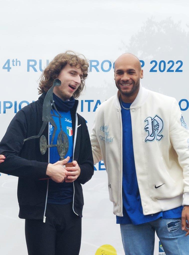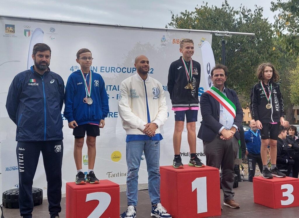 LE GARE - Il campione olimpico dei 100 e della 4x100 ha presenziato alle premiazioni delle gare sprint della categoria esordienti, incoronando due atleti trevigiani di ATL-Etica San Vendemiano, Matilde Bramerini e Filippo Antonio Timeo, che hanno così vissuto l’emozione di essere premiati da uno dei campioni più famosi al mondo. Un atleta del progetto “Autista Footbike”, Stefano Colle, e Jacobs si sono poi scambiati due splendidi trofeo realizzati dallo scultore trevigiano Claudio Rottin. Stefano abita a Bibione e si è avvicinato alla footbike grazie alle attività di promozione svolte sul territorio veneziano da ATL-Etica San Vendemiano, che l’ha poi tesserato e l’accoglie con i propri tecnici sulla pista del Coneglianese per due allenamenti alla settimana. ATL-Etica è stata tra le società mattatrici della rassegna tricolore, con ben 17 titoli italiani vinti. Sul gradino più alto del podio tricolore, con uno o più titoli, Matilde Bramerini (200 metri sprint esordienti, Endurance 7 km), Filippo Antonio Tineo (200 metri sprint esordienti, Endurance 7 km), Elia Ros (400 metri sprint cadetti, Criterium 7 km cadetti, Endurance 14 km cadetti), Gioia Cendron (400 metri sprint cadette, Criterium 7 km cadette, Endurance 14 km cadette), Endora Marcato (400 metri sprint senior, Criterium 14 km seniores, Endurance 28 km seniores), Giovanna Troldi (400 metri sprint veterani), Moira Forner (Criterium 14 km veterani, Endurance 28 km veterani), Davis Colombo (Endurance 42 km master). Un oro anche per la Nuova Atletica Tre Comuni, società di Oderzo, prima con Sandra Sartori tra le master impegnate nel Criterium 14 km.