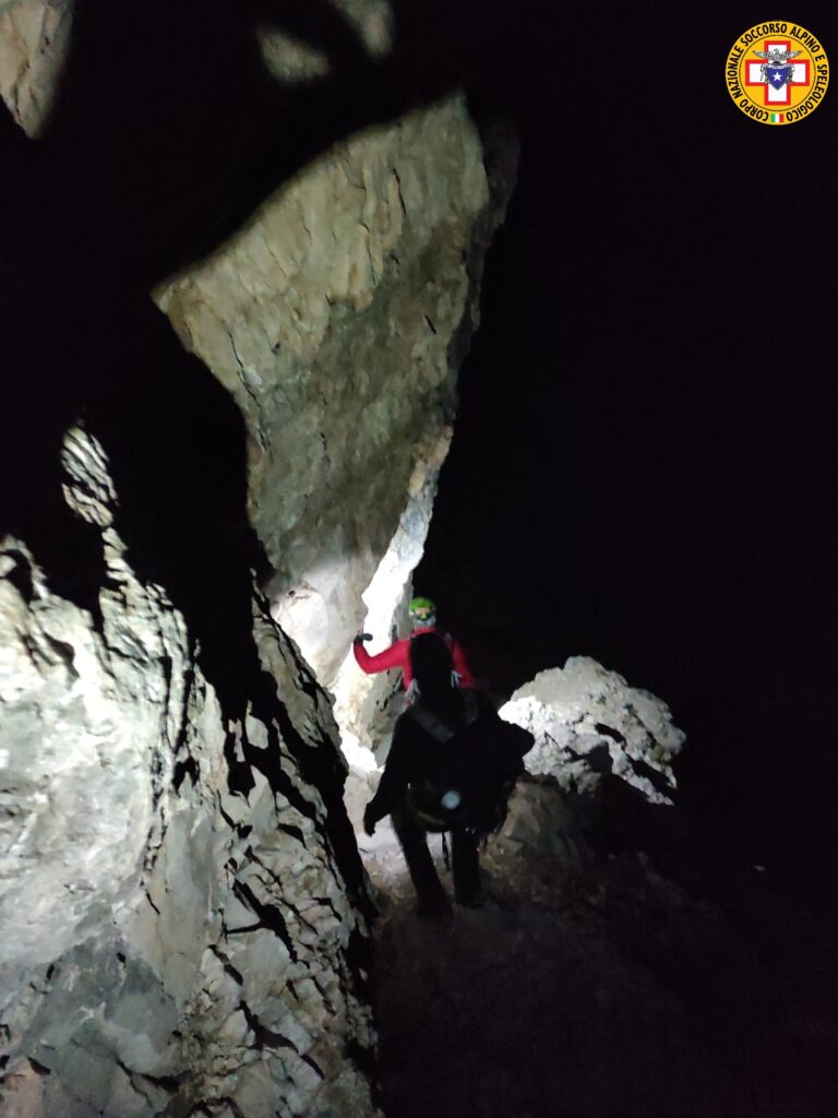Sei soccorritori si sono portati all'inizio della via, mentre nevischiava e si stava formando una patina ghiacciata sulla roccia, e hanno cominciato la salita, finché non li hanno individuati a circa metà del rientro. I due avevano abbandonato le corde più in alto, tentando di scendere slegati arrampicottando, per poi essere costretti a fermarsi.