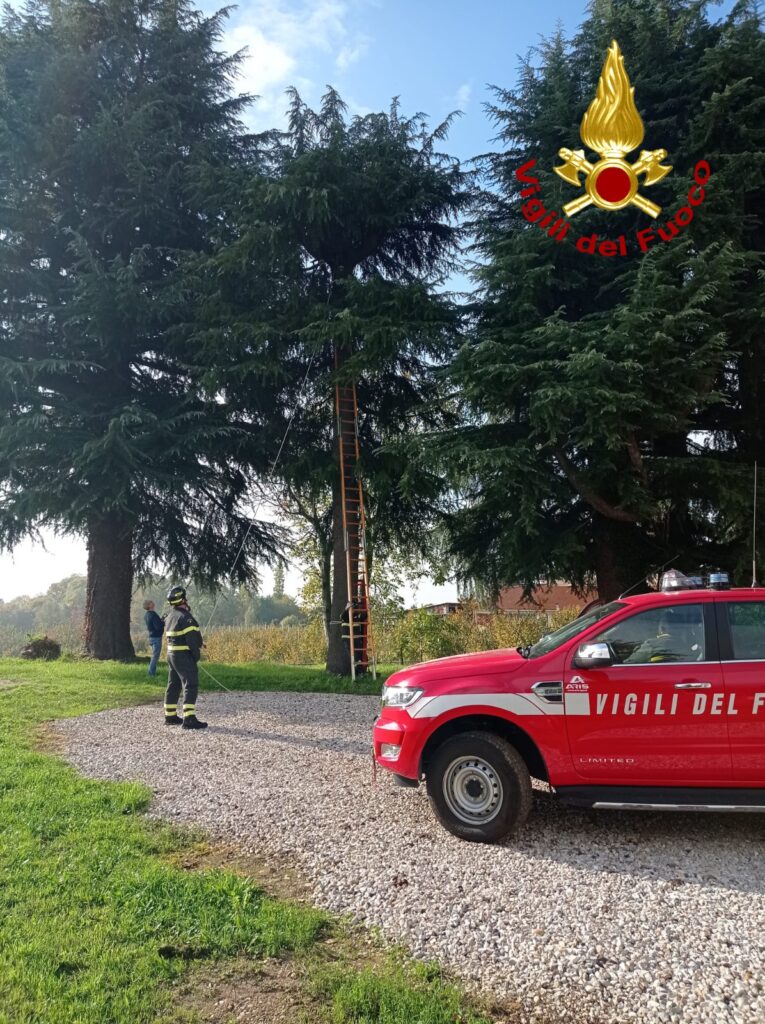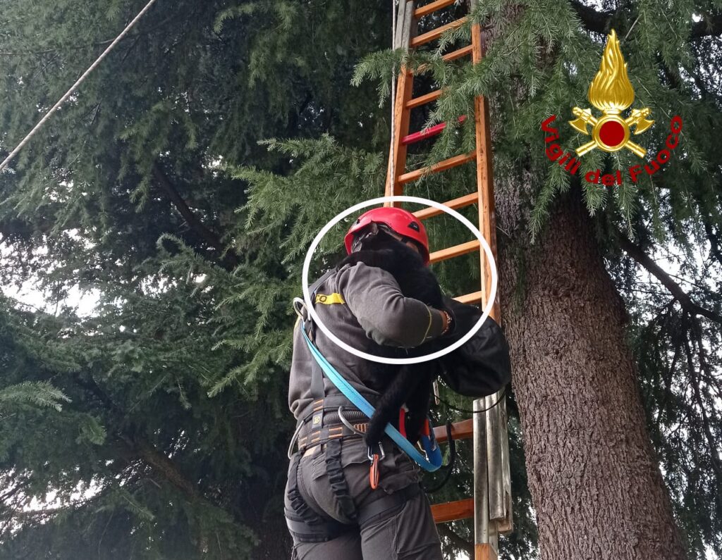 Quando “Omero” ha visto il vigile del fuoco raggiungerlo a oltre 12 metri di altezza, non ha avuto dubbi ed è subito salito sulla spalla del suo soccorritore, che l’ha portato a terra dai suoi felici padroni. Il salvataggio dei vigili del fuoco di Bassano del Grappa, venerdì mattina in Via Farneda a Fara Vicentino, dopo essere stati chiamati dai proprietari di Omero. Il gatto si trovava in prossimità della cima del pino e non riusciva più a muoversi, ma solo a miagolare per attirare l’attenzione.