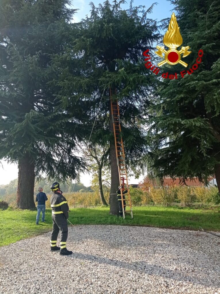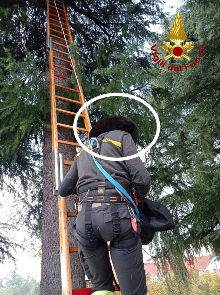 Bloccato a oltre 12 metri in cima al pino: "Omero" soccorso dai pompieri