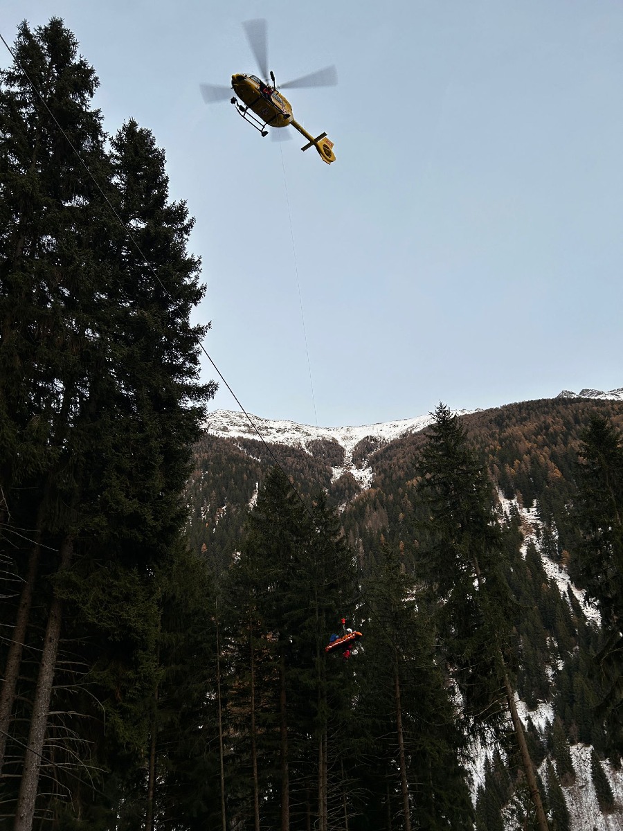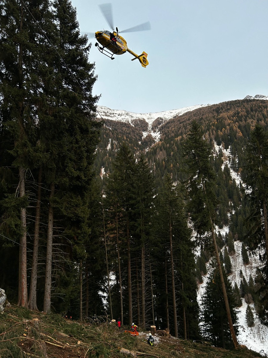 Boscaiolo travolto da un tronco a Cogolo di Peio: intervento del Soccorso Alpino e recupero con elicottero.