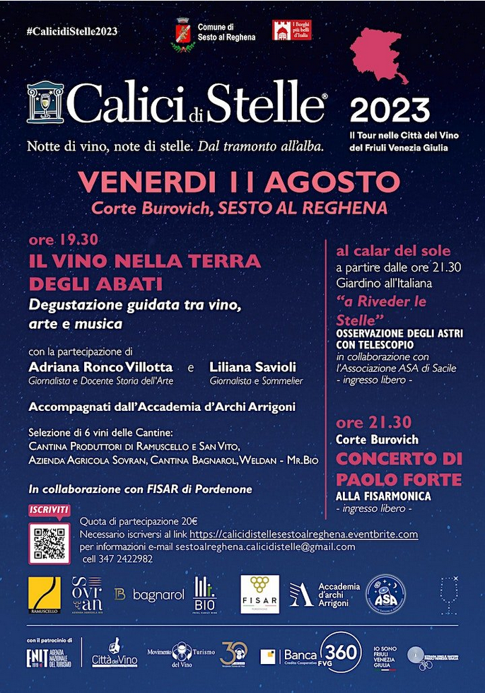 Calici di Stelle nelle Città del Vino dei Friuli Venezia Giulia: la manifestazione fa tappa per la prima volta a Sesto al Reghena venerdì 11 agosto. Il calendario degli appuntamenti prevede alle ore 19.30 “Il Vino nella Terra degli Abati – Degustazione guidata tra vino, arte e musica” con la partecipazione di Adriano Ronco Villotta (giornalista e docente Storia dell’Arte) e Liliana Savioli (giornalista e sommelier) accompagnati dall’Accademia d’Archi Arrigoni. Selezione di 6 vini delle seguenti Cantine: Cantina Produttori di Ramuscello e San Vito, Azienda agricola Sovran, Cantina Bagnarol, Weldan-Mr Bio.