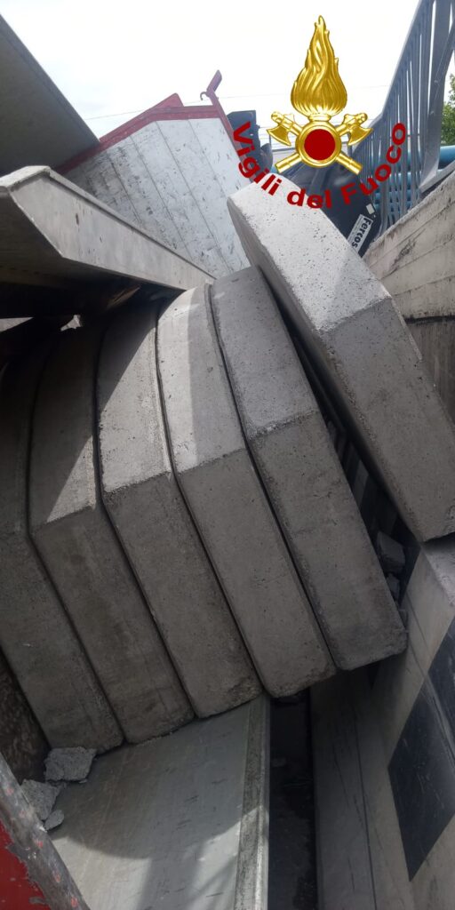 Camion carico di contrappesi di cemento si rovescia lungo la strada
