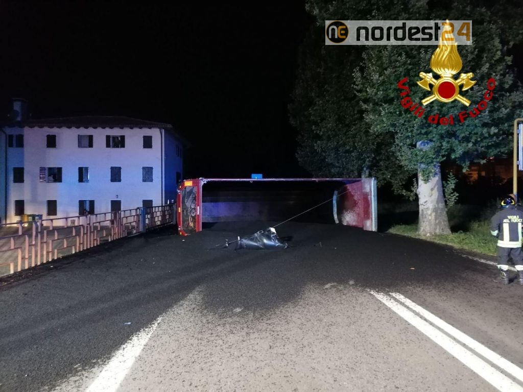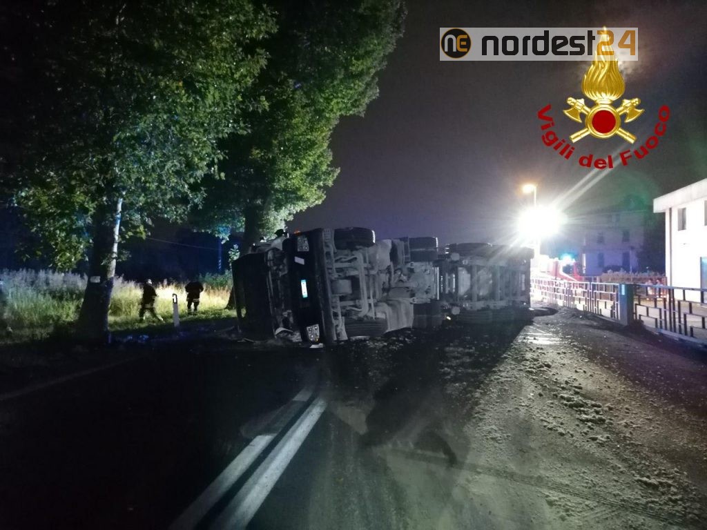 Nella notte di oggi sabato 24 luglio 2021 verso le ore 1:45 i vigili del fuoco di Treviso con il supporto della autogru sono intervenuti per il ribaltamento di un camion che trasportava asfalto lungo la SS 13 all'altezza di Spresiano in via Nazionale.