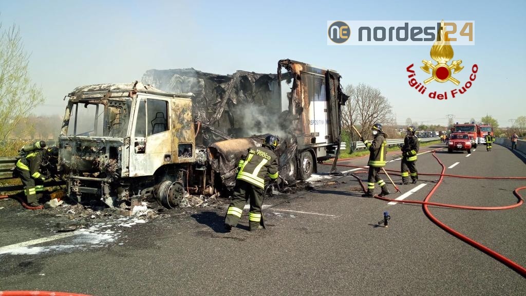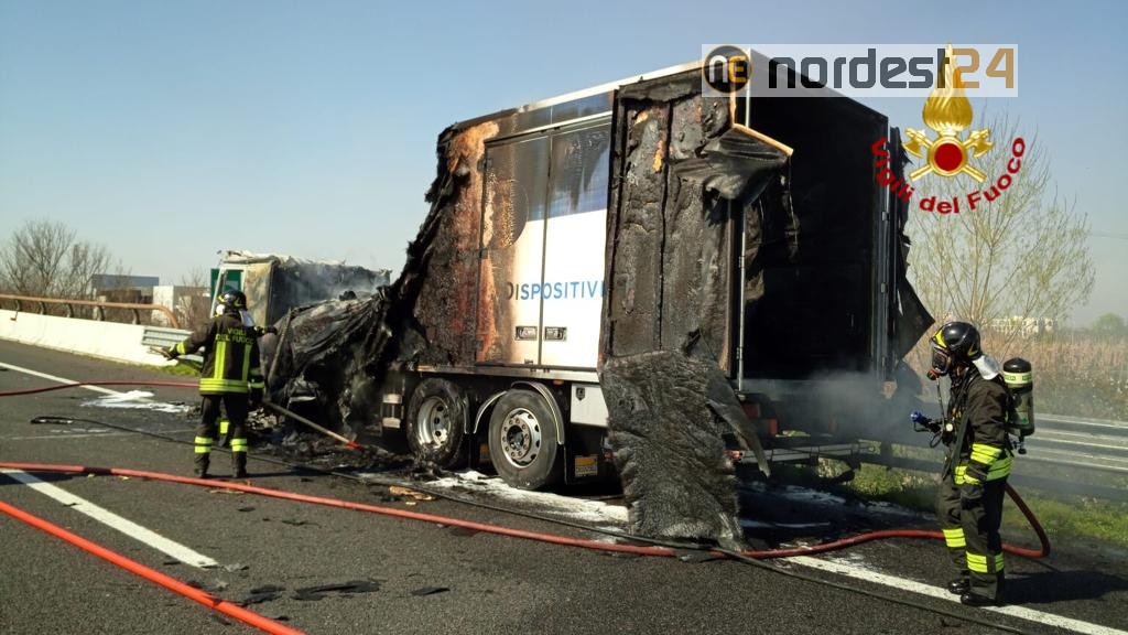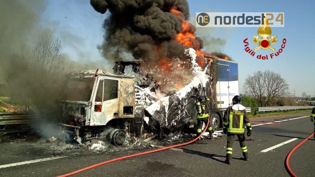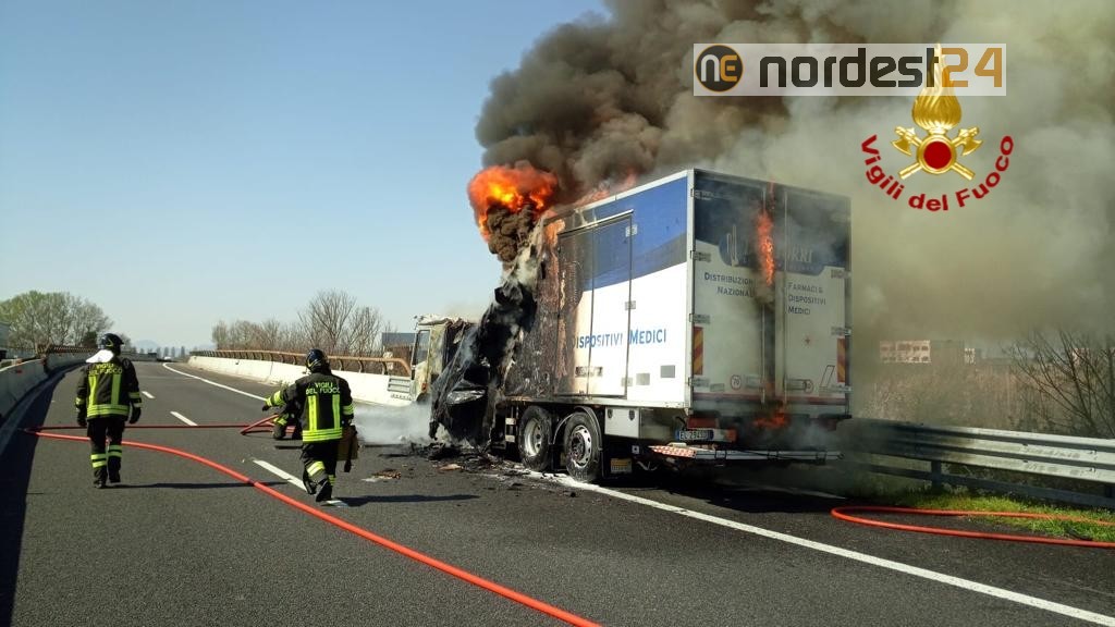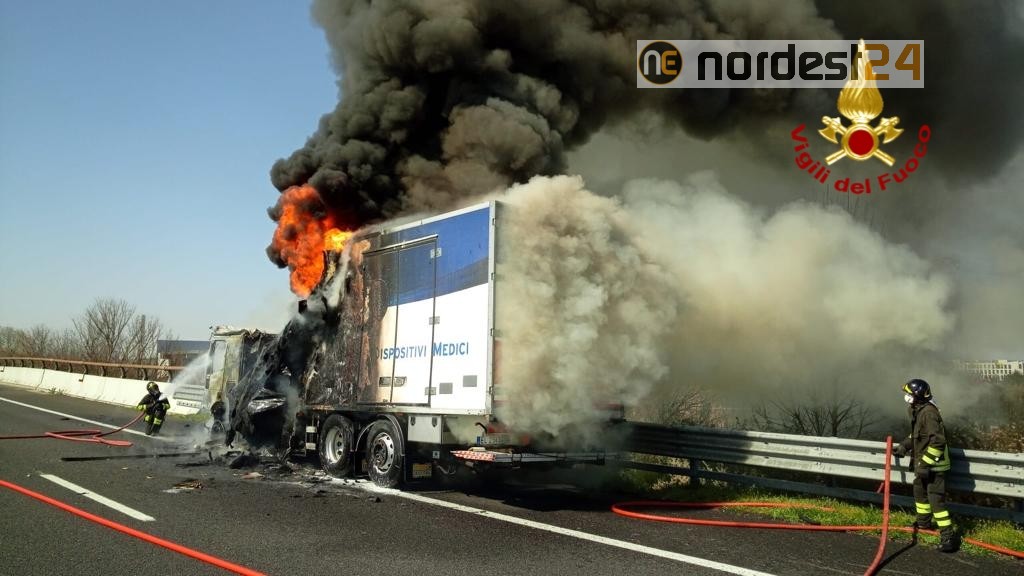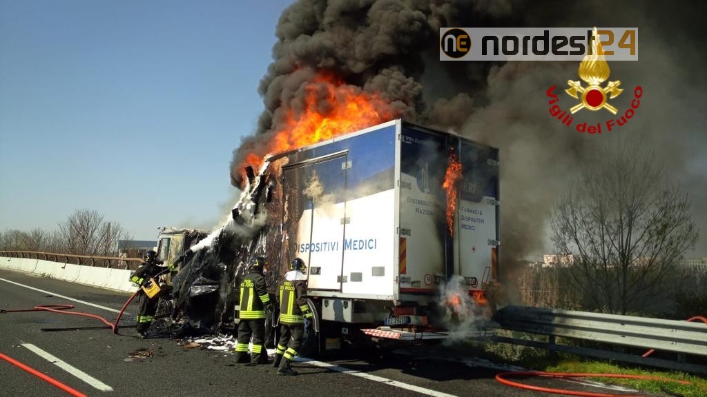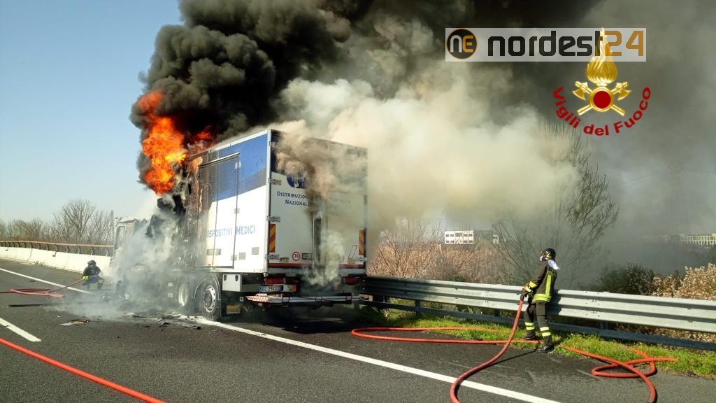 Alle 10:55, i vigili del fuoco sono intervenuti lungo l’autostrada A13 al km 108 poco prima del casello Padova zona Industriale per l’incendio di un camion frigo adibito a trasporti dispositivi medici.