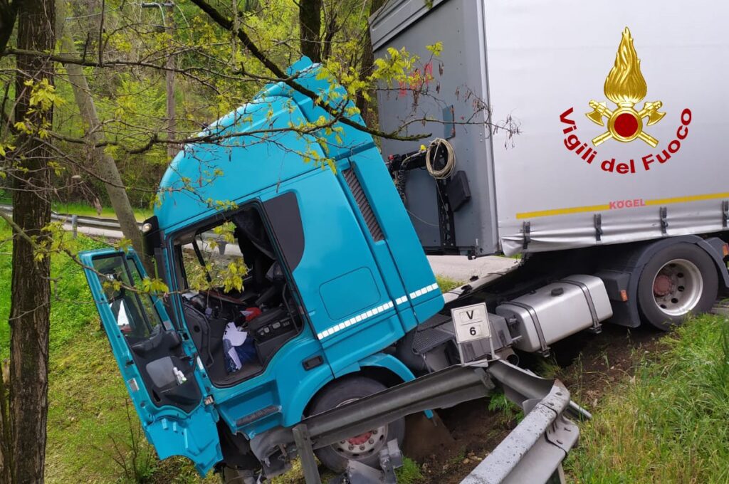Camion sfonda il guardrail e si ferma contro gli alberi: illeso l’autista